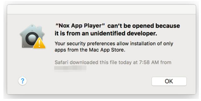 3. You may also see the below warning when you start Nox Mac version the first time. Here we assure you that Nox for Mac is a safe software you could trust. Please open the System Preferences window — click the Apple icon at the top-left corner of your screen or click the System Preferences icon on your dock — and click the Security & Privacy icon. Click the lock icon, enter your password, and set the “Allow apps downloaded from” option to “Anywhere.” Or click the “Open Anyway” button to bypass Gatekeeper in Mac.