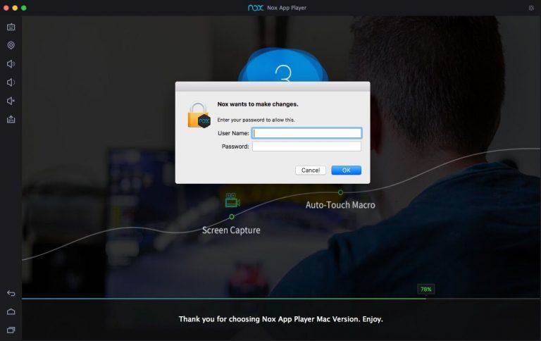 2. Then when Nox App Player for Mac starts to boot, you’ll see the below message box asking you to type your password. This is because Nox Mac version need to install VirtualBox. Please type your password and click OK. If you don’t see this message box the first time you start Nox Mac version, then there might be something wrong with the installation. Please try re-install Nox. Another possibility this does not appear is that you already have other version of VirtualBox in your Mac. The version Nox trying to install is the one that works with Nox Mac Version the best, we suggest that you uninstall your current VirtualBox version and restart Nox so the most compatible version could be installed.